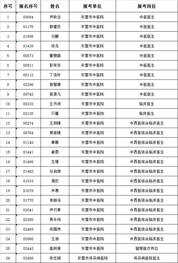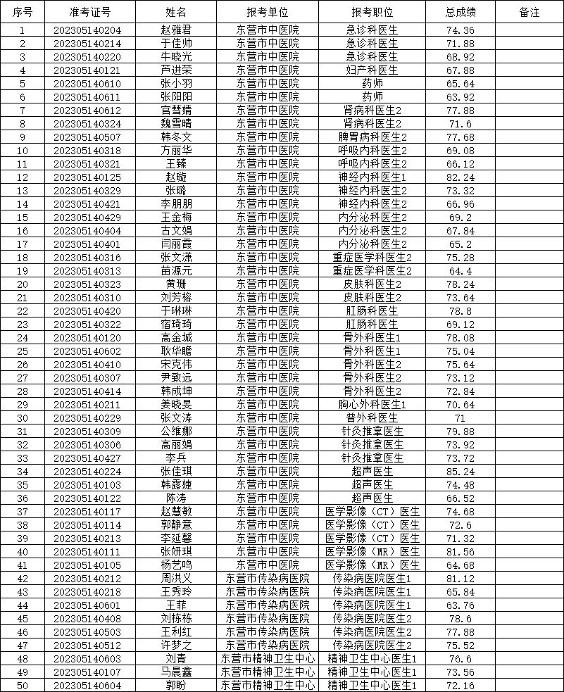 根据《2023年东营市中医院(东营市传染病医院、东营市精神卫生中心)公开招聘工作人员简章》规定,因放弃或取消资格造成的空缺,按笔试成绩由高分到低分依次等额递补。现将2023年东营市中医院(东营市传染病医院、东营市精神卫生中心)公开招聘递补进入面试资格审查范围人员名单(第一批)予以公布(见附件)。请递补进入面试
