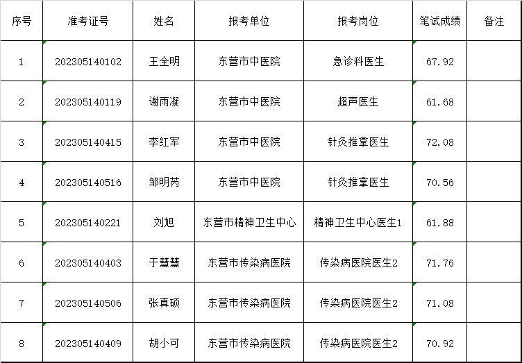 根据《2023年东营市中医院(东营市传染病医院、东营市精神卫生中心)公开招聘工作人员简章》,现将2023年东营市中医院(东营市传染病医院、东营市精神卫生中心)公开招聘有关事项公告如下:一、笔试合格分数线2023年东营市中医院(东营市传染病医院、东营市精神卫生中心)公开招聘工作人员笔试合格分数线为:笔试成绩不低于