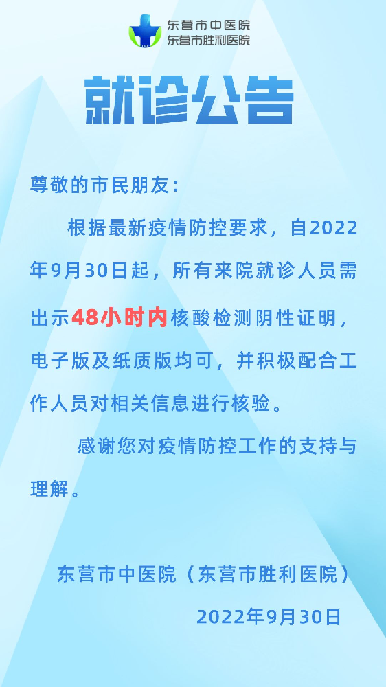 根据《2022年东营市中医院(东营市传染病医院、东营市精神卫生中心)公开招聘工作人员简章》及有关规定,现将2022年东营市中医院(东营市传染病医院、东营市精神卫生中心)公开招聘工作人员体检有关事项通知如下:一、集合时间2022年8月20日上午6:30分。二、集合地点东营市中医院行政办公楼(东营市北二路107号)集合