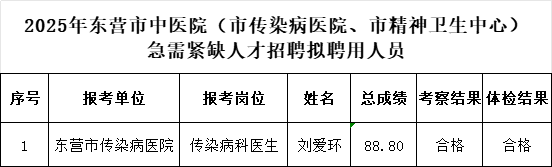 根据《2025年东营市中医院(东营市传染病医院、东营市精神卫生中心)公开招聘工作人员简章》规定,因放弃或取消面试资格造成的空缺,从达到笔试合格分数线的应聘人员中按笔试成绩依次递补并面向社会公布。现将2025年东营市中医院(东营市传染病医院、东营市精神卫生中心)公开招聘工作人员递补进入面试资格审查范围人员名单