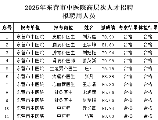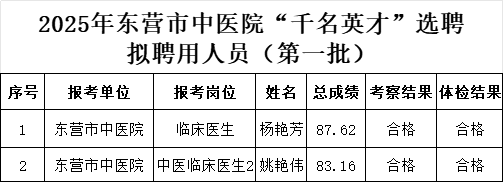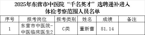 按照《2025年东营市市属事业单位“千名英才”选聘公告》规定,对放弃体检、考察或体检、考察不合格造成的空缺,从进入同一岗位考核评价范围、达到考核评价合格分数线的人员中依次等额递补。现将2025年东营市中医院“千名英才”选聘递补进入体检考察范围人员名单予以公布。联系电话:0546-8811475