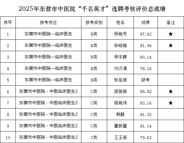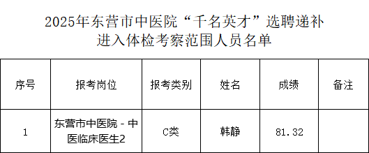 按照《2025年东营市市属事业单位“千名英才”选聘公告》规定,对放弃体检、考察或体检、考察不合格造成的空缺,从进入同一岗位考核评价范围、达到考核评价合格分数线的人员中依次等额递补。现将2025年东营市中医院“千名英才”选聘递补进入体检考察范围人员名单予以公布。联系电话:0546-8811475 东