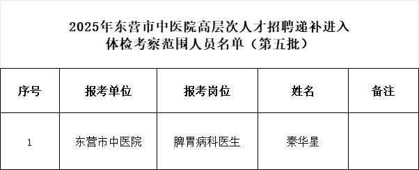 按照《2025年东营市中医院高层次人才招聘简章》规定,对放弃体检、考察或体检、考察不合格造成的空缺,从进入同一岗位面试范围,达到面试合格分数线的人员中依次等额递补。现将2025年东营市中医院高层次人才招聘递补进入体检考察范围人员名单(第五批)予以公布。联系电话:0546-8811475 东营市中