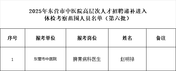 按照《2025年东营市中医院高层次人才招聘简章》规定,对放弃体检、考察或体检、考察不合格造成的空缺,从进入同一岗位面试范围,达到面试合格分数线的人员中依次等额递补。现将2025年东营市中医院高层次人才招聘递补进入体检考察范围人员名单(第六批)予以公布。联系电话:0546-8811475 东营
