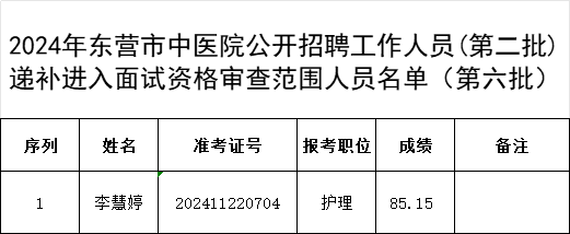 根据《2024年东营市中医院公开招聘工作人员(第二批)简章》规定,因放弃或取消资格造成的空缺,按笔试成绩依次等额递补。现将2024年东营市中医院公开招聘工作人员(第二批)递补进入面试资格审查范围人员名单(第六批)予以公布。请递补进入面试资格审查范围人员按照《2024年东营市中医院公开招聘工作人员(第二批)面试
