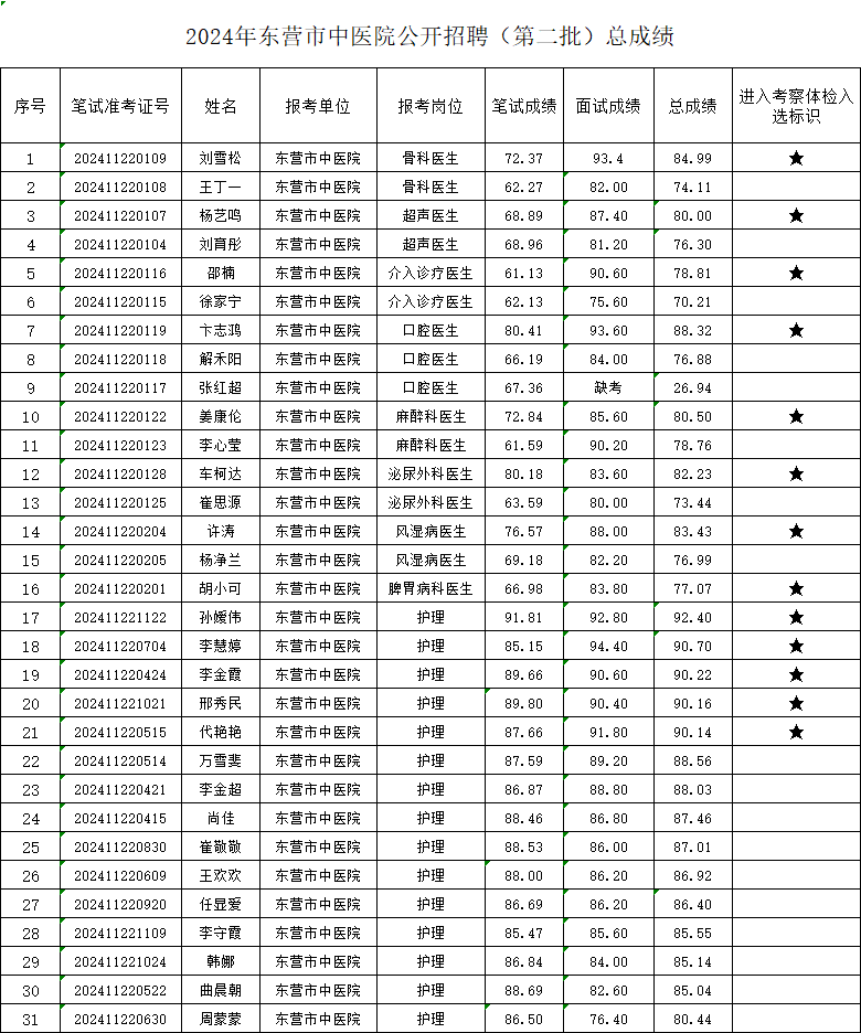 根据《2024年东营市中医院公开招聘工作人员(第二批)简章》,按笔试成绩40%和面试成绩60%的比例计入考试总成绩。现将2024年东营市中医院公开招聘工作人员(第二批)总成绩予以公布。按照考试总成绩排名,分职位,按1:1比例等额确定体检考察人选。如同一个招录职位出现应考人员考试总成绩相同,则按笔试成绩由高分到低分确