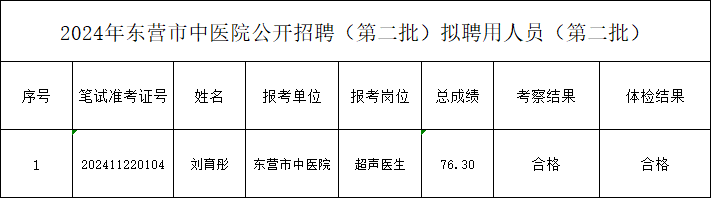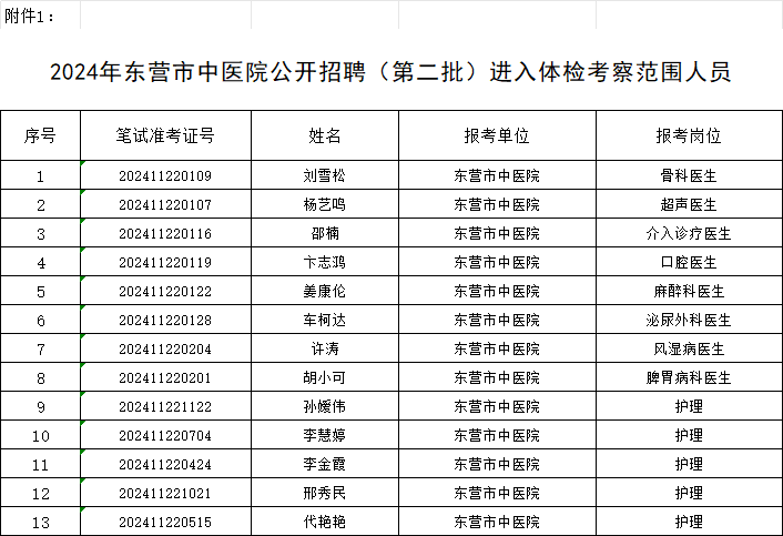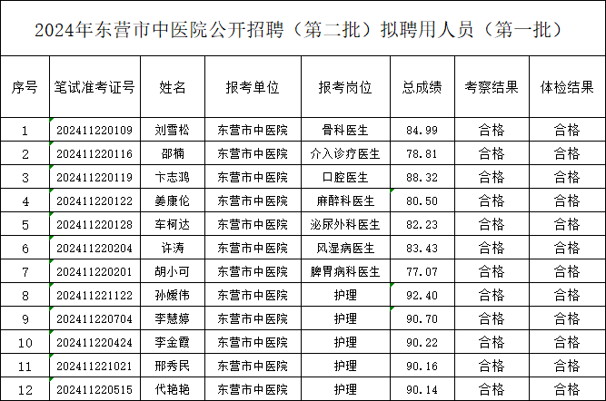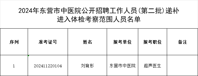 按照《2024年东营市中医院公开招聘工作人员(第二批)简章》规定,对放弃考察、体检或考察、体检不合格等情况造成的空缺,从进入同一岗位面试范围的人员中依次等额递补。现将2024年东营市中医院公开招聘(第二批)递补进入体检考察范围人员名单予以公布。联系电话:0546-8811475