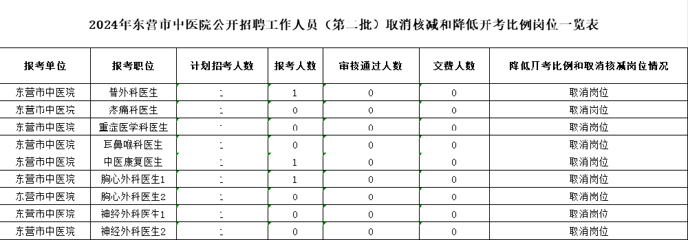 2024年东营市中医院公开招聘工作人员(第二批)网上报名工作已结束。经市事业单位公开招聘主管机关批准,对应聘人数与拟招聘人数之比达不到3:1的招聘岗位,原则上取消或核减招聘岗位计划。对于近3年来在公开招聘因报考人数不足取消、核减的专业岗位以及急需紧缺专业的岗位,经市事业单位人事综合管理部门批准,可适当降低开