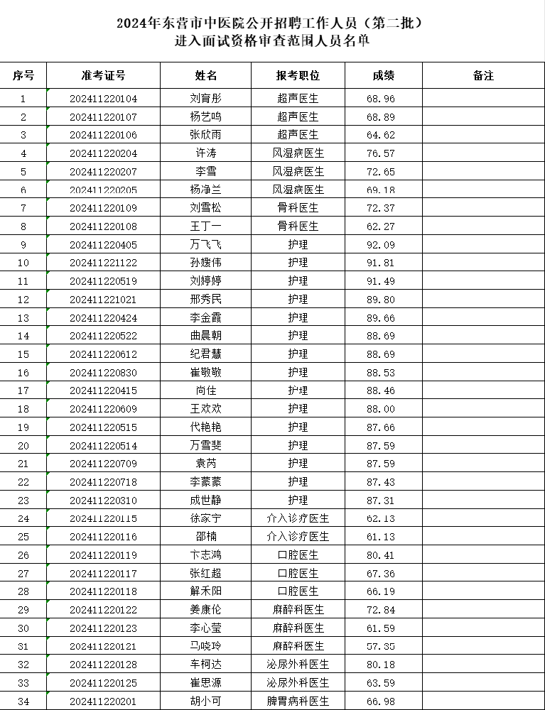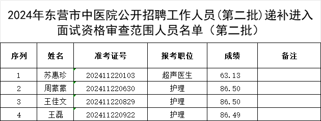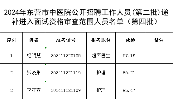 根据《2024年东营市中医院公开招聘工作人员(第二批)简章》规定,因放弃或取消资格造成的空缺,按笔试成绩依次等额递补。现将2024年东营市中医院公开招聘工作人员(第二批)递补进入面试资格审查范围人员名单(第四批)予以公布。请递补进入面试资格审查范围人员按照《2024年东营市中医院公开招聘工作人员(第二批)面试资格审