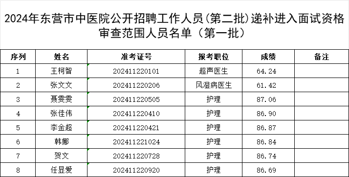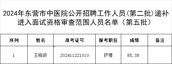 根据《2024年东营市中医院公开招聘工作人员(第二批)简章》规定,因放弃或取消资格造成的空缺,按笔试成绩依次等额递补。现将2024年东营市中医院公开招聘工作人员(第二批)递补进入面试资格审查范围人员名单(第五批)予以公布。请递补进入面试资格审查范围人员按照《2024年东营市中医院公开招聘工作人员(第二批)面试资格审