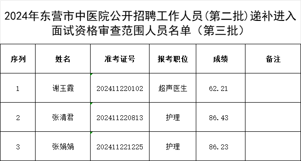 根据《2024年东营市中医院公开招聘工作人员(第二批)简章》规定,因放弃或取消资格造成的空缺,按笔试成绩依次等额递补。现将2024年东营市中医院公开招聘工作人员(第二批)递补进入面试资格审查范围人员名单(第二批)予以公布。 请递补进入面试资格审查范围人员按照《2024年东营市中医院公开招聘工作人员