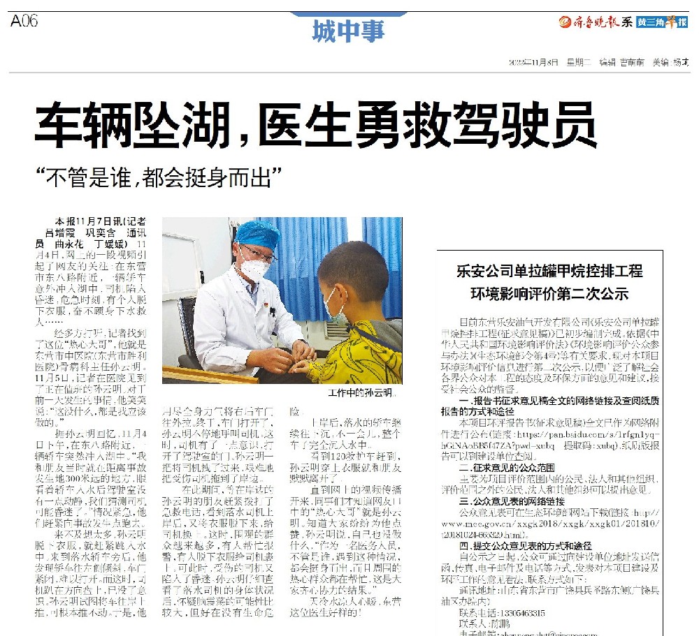 【齐鲁晚报·黄三角早报】车辆坠湖,医生勇救驾驶员